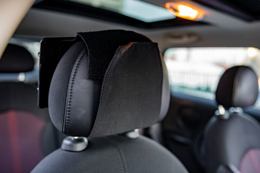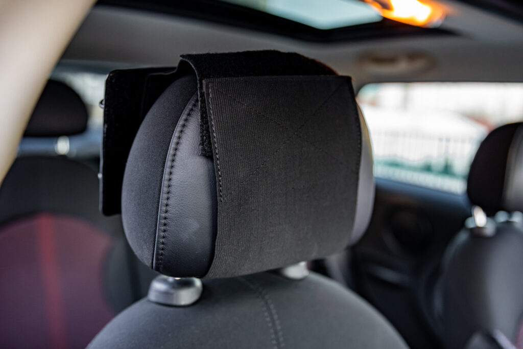 Step 1: Wrap the velcro sleeve vertically around the headrest of the front passenger seat.